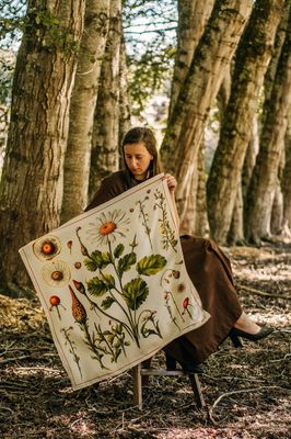 A vintage-style botanical illustration featuring a central chamomile-like daisy surrounded by buds, seed heads, and stems in varying stages of growth. The warm cream background highlights the rich greens and golden accents, giving the scarf an elegant, naturalist feel with a gentle heritage touch.
