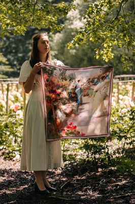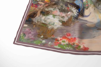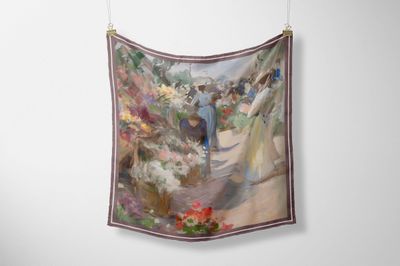 An impressionist-style market scene with women walking among baskets of flowers, rendered in loose, painterly strokes. The mix of soft neutrals and muted floral tones gives the scarf a romantic, vintage feel, capturing the gentle movement and colour of an outdoor flower market.