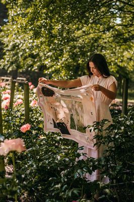 A softly textured painting of a woman standing at a window, looking out onto a gentle landscape of fields and blooms. The scene feels intimate and quiet, framed by hand-painted florals and rendered in loose, expressive strokes that give the scarf a dreamy, contemplative mood.