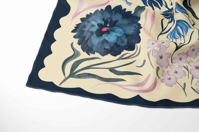 A whimsical, hand-painted floral arrangement set within a scalloped frame, combining loose brushwork with stylised botanical forms. The mix of flowing stems, soft petals, and layered blooms gives the scarf an artistic, storybook charm with a modern, feminine edge.