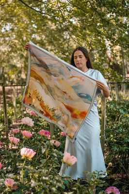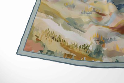 The scarf features muted, harmonious tones: misty blues, soft sage, and pale olive wash across the mountains. Warm ochre, muted mustard, dusty peach, and terracotta add gentle warmth, while touches of cool slate blue and muted teal deepen the shadows. Hints of creamy beige and soft blush highlight the sunlit areas. The border is a muted steel-blue with a darker blue inner line.