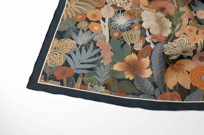 A richly detailed garden scene overflowing with stylised blooms and layered foliage, creating a lush, tapestry-like composition. The dense arrangement and warm-toned florals give the scarf an elegant, autumnal feel with a modern illustrative touch.