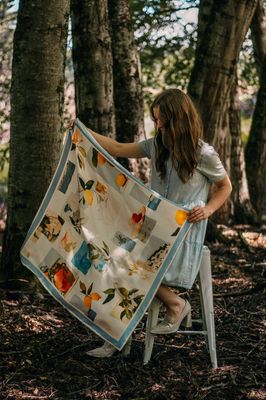 The palette is warm and breezy: soft cream and warm ivory form the base, while accents of sky blue, cornflower blue, and muted sea teal appear throughout the blocks. Lemons bring bright, true yellow with fresh green leaves in olive, sage, and deep leaf green. Terracotta, blush peach, sandy beige, and muted clay tones appear in the pottery and landscape details. The border is a powdery mid-blue with a thin white inner line.