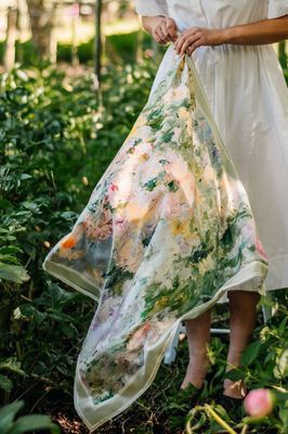 A lush, impressionistic field of florals painted in thick, expressive strokes, creating a soft, dreamlike tapestry of colour. The fluid blending of petals and greenery gives the scarf a romantic, garden-inspired feel full of movement and light.