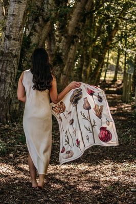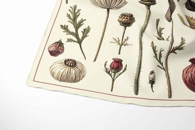 A vintage-style botanical study of poppy pods and blooms, arranged in a clean, museum-like layout. The fine detailing and natural textures give the scarf an elegant, archival quality with a gentle antique charm.