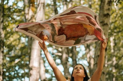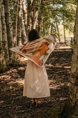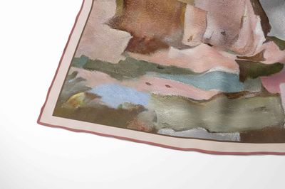 An abstract landscape rendered in soft, blended blocks of colour, creating a calm, atmospheric composition. The loose forms and gentle transitions give the scarf a painterly, contemporary feel with hints of terrain and natural structure.
