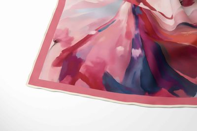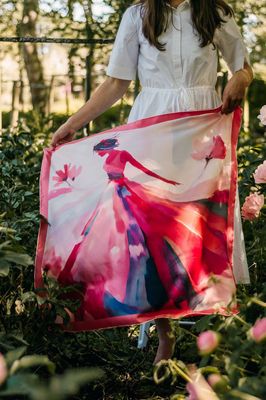 This scarf presents a dreamy, fluid portrait of a woman in motion, her gown sweeping across the scene like a painted sunrise. The silhouette is soft and romantic, blending seamlessly into an abstract landscape of petals and drifting colour. The piece feels like a moment caught in movement—weightless, expressive, and beautifully feminine—perfect for a design that leans into emotion and artistry rather than literal detail.