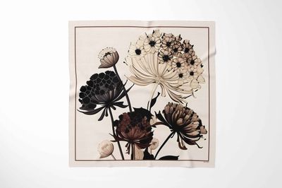 A dramatic bouquet of oversized blooms arranged against a deep black background, painted in soft, layered strokes. The rich contrast and romantic florals give the scarf a moody, luxurious feel.