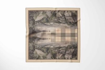 A mirrored countryside scene blends softly painted cottages and fields with a central plaid motif, creating a fusion of heritage landscape and classic textile patterning. The symmetry and muted tones give the scarf a refined, old-world character with a contemporary twist.
