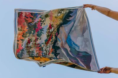 The palette is rich and varied: warm corals, soft peaches, sunny yellows, and creamy whites appear in the flowers, balanced by cool lilac, periwinkle, and soft sky blues. Greens range from deep forest and pine to sage, mint, and olive. The mountains blend slate blue, dusty violet, clay, and taupe. The border is a soft beige with a thin powder-blue inner line.