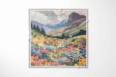 A vibrant mountain meadow scene bursting with wildflowers, painted in lively, layered strokes. The sweeping landscape and colourful blooms create an uplifting, scenic composition full of movement and freshness.