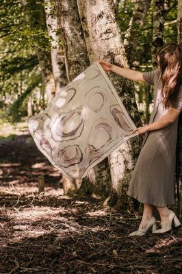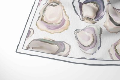 A soft, watercolour-style arrangement of oyster shells scattered across the scarf in an elegant, organic layout. The gentle blending and translucent layers give the design a coastal, airy feel.