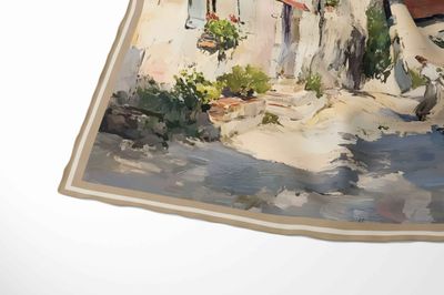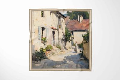A serene village street scene painted in soft impressionistic strokes, featuring sunlit stone houses, blooming window boxes, and a lone figure walking through the quiet lane. The gentle colours and dappled light create a peaceful, nostalgic atmosphere.