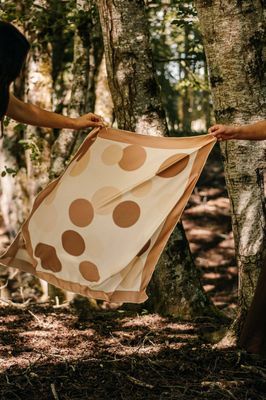 This design is a modern, minimalist study in shape and balance. A soft, neutral ground becomes the canvas for scattered circular forms, each one floating as though suspended in quiet motion. The arrangement is intentionally irregular—playful but still refined—creating a gentle rhythm across the scarf. With its clean geometry and airy spacing, the piece feels contemporary, versatile, and effortlessly polished.