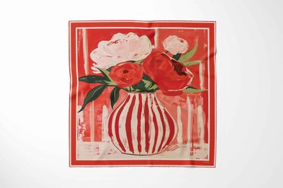 A bold, painterly still life featuring full, expressive blooms gathered in a charming striped vase. Loose brushstrokes and confident colour blocking give the piece energy and warmth, blending classic florals with a modern, uplifting feel