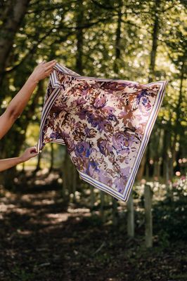 A dense, stylised floral pattern with layered petals and foliage, creating a rich, tapestry-like effect. The bold interplay of purples and deep neutrals gives the scarf a dramatic, moody elegance.