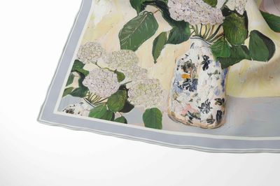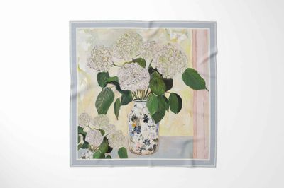 Soft, serene, and effortlessly elegant, this beautiful scarf features a delicate arrangement of creamy white hydrangeas set in a patterned vase. Gentle washes of pale yellow, blush, and muted peach form a dreamy backdrop, while soft green leaves add a natural, calming balance. Framed with a subtle border, the design feels both timeless and quietly sophisticated.