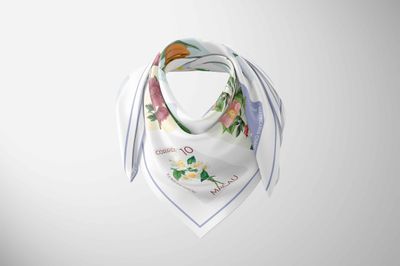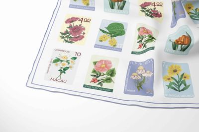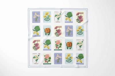 A sweet and delicate design, this charming scarf features a collection of illustrated floral stamps arranged in a neat, playful grid. Each stamp showcases a different bloom—from soft yellow blossoms and blush pink petals to fresh green leaves—set against gentle pastel backdrops of lilac, sky blue, and warm neutrals. The result is a light, cheerful print with a nostalgic, nature-inspired feel.