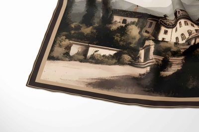 Evoking the serene beauty of a sun-drenched European landscape, this exquisite silk scarf showcases a graceful countryside villa nestled among slender cypress trees and rolling hills. Rendered in sophisticated hues of warm ivory, soft taupe, muted olive, dusky sage and gentle sky blue, and framed by a refined deep mocha border, the palette feels both calming and luxurious.