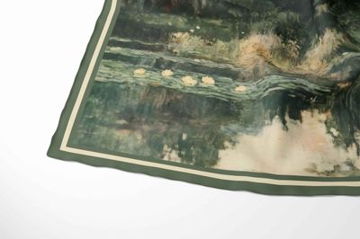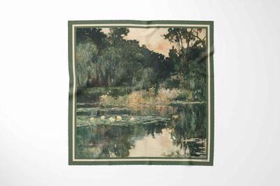 Inspired by tranquil waterside landscapes, this refined silk scarf captures a moment of quiet beauty, where soft reflections meet lush greenery. Painted in layered tones of deep forest green, muted sage, moss, warm stone and gentle ivory, the design is framed with an elegant coordinating border that enhances its timeless appeal.