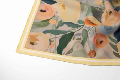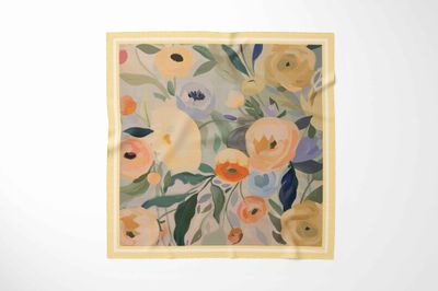 Delicate, feminine, and effortlessly elegant, the Soft Bloom Silk Scarf captures the beauty of a quiet garden in full bloom. Painted in a harmonious palette of warm peach, buttercream, sage green, and soft sky blue, this design blends flowing florals with gentle movement for a timeless, romantic feel.