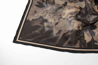 Striking and sophisticated, this elegant silk scarf showcases a bold floral composition rendered in layered tones of charcoal, soft stone, warm taupe and creamy ivory. Set against a deep shadowed backdrop and framed with a refined dark border, the design feels both contemporary and timeless, celebrating contrast, texture, and artistic depth.