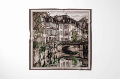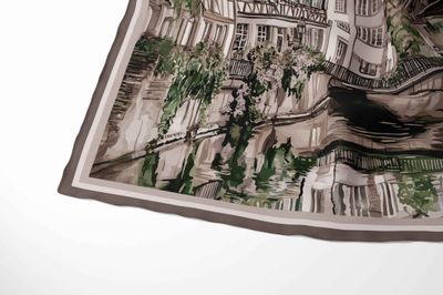 Elegant and timeless, the Old Town Silk Scarf captures the romance of a quiet European canal scene. Framed by classic architecture, soft stone facades, and gently trailing greenery, the design reflects a moment of stillness as water mirrors the charm of the buildings above.