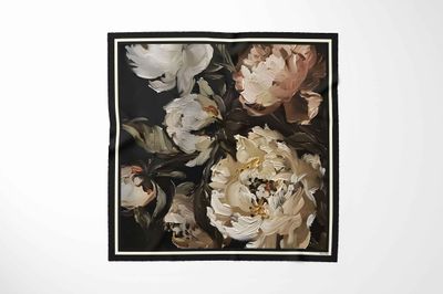 A rich, elegant floral design set against a deep dark background. Soft tones of cream, warm beige, and muted blush create a striking contrast, with textured brushstrokes giving the flowers a full, layered look.