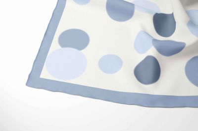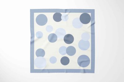 A softly modern silk scarf featuring a delicate scatter of layered blue circles on a clean ivory base, framed with a gentle sky-blue border. The tonal mix of pale and deeper blues creates a calm, airy feel—effortlessly elegant and easy to style. Crafted from smooth silk with a fluid drape, it adds a subtle pop of colour whether worn around the neck, in the hair, or tied to a handbag.